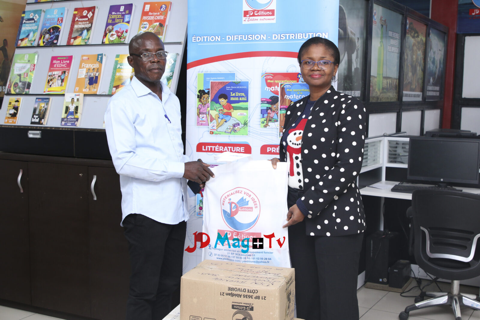 Ce mardi 23 juillet 2024, dans les locaux de JD Éditions, madame DJÉBOUÉ Amon Liliane, responsable du Service commercial de JD Éditions, a remis un lot de kits scolaires à monsieur DANHO Claude, représentant le sous-préfet de Biankouma, monsieur Christ Richard KONÉ.
