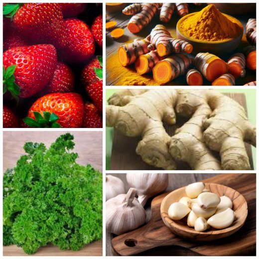 Les aliments riches en vitamine C comme les agrumes (oranges, citrons, mandarines pamplemousse etc.) la fraise, la tomate, la goyave, le persil, la salade, les choux, le poivron et ceux riches en vitamine A comme la carotte, la tomate, les choux, le persil et le foie ; renferment des éléments nutritifs qui stimulent le système immunitaire. Il en est de même pour le curcuma, qui possède des propriétés antibactériennes et antibiotiques. Il inhibe la croissance de lymphomes, tumeurs cancéreuses. De plus, un de ses composés, la curcumine est un très puissant antioxydant. On peut l’associer au poivre noir, au gingembre et au cumin.