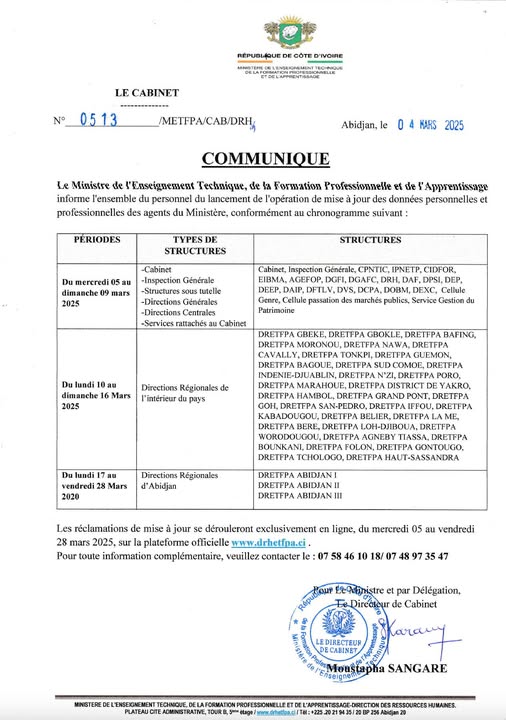 Paradmin14765 mars 2025Enseignement Technique / Chronogramme du lancement de l’opération de mise à jour des données personnelles et professionnelles des agents du METFPA. Source :...