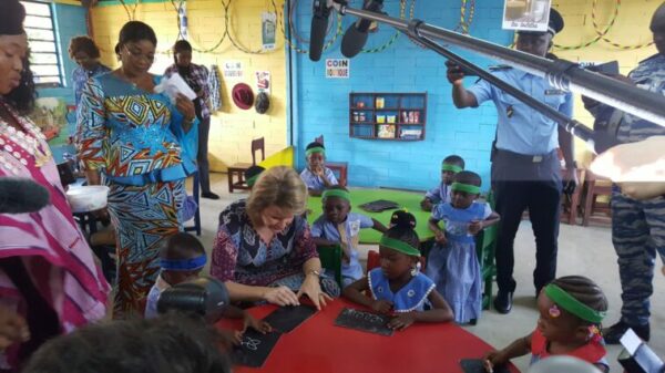 La Reine des Belges, Mathilde d’Udekem d’Acoz a effectué une visite, mardi 5 mars 2024 à Abidjan-Yopougon, au bâtiment préscolaire de l’école G.S...