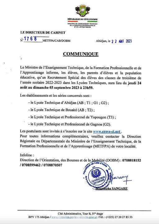 Paradmin147623 août 2023Le ministère de l’Enseignement Technique, de la Formation professionnelle et de l’Apprentissage lance du jeudi 24 août au dimanche 03 septembre 2023, un...