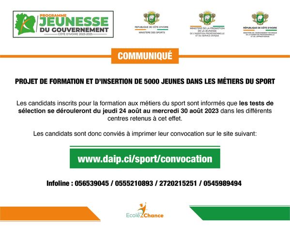 Paradmin147623 août 2023METFPA Sélection de 5000 jeunes ivoiriens aux métiers du sport, les convocations sont disponibles sur le site : www.daip.ci #2023AnnéeDeLaJeunesse #gouvernementdecotedivoire #ecoledeladeuxiemechance #E2C...