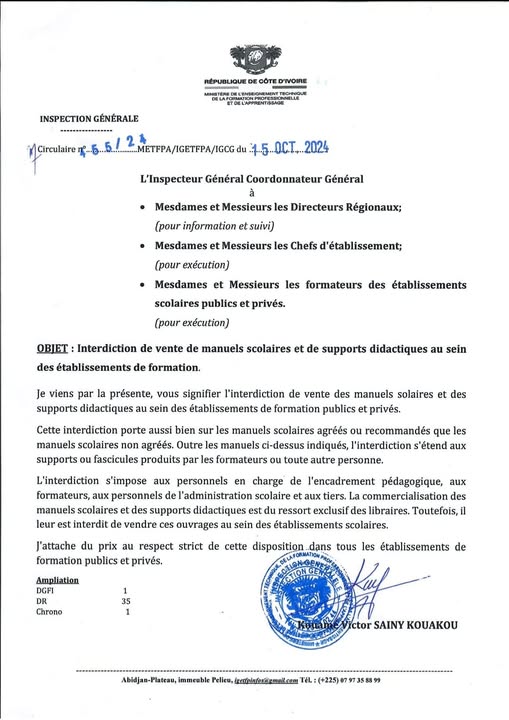 Paradmin14764 décembre 2024Enseignement Technique / Rappel : Interdiction de vente de manuels scolaires et de supports didactiques au sein des établissements de formation. Source :...