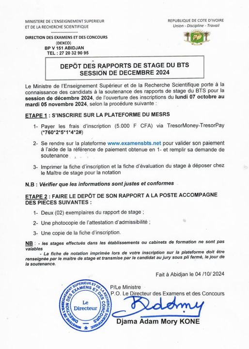 Paradmin14768 octobre 2024Enseignement Supérieur / Dépôt des rapports de stage du BTS session de décembre 2024. Source : enseignement.superieur.ci