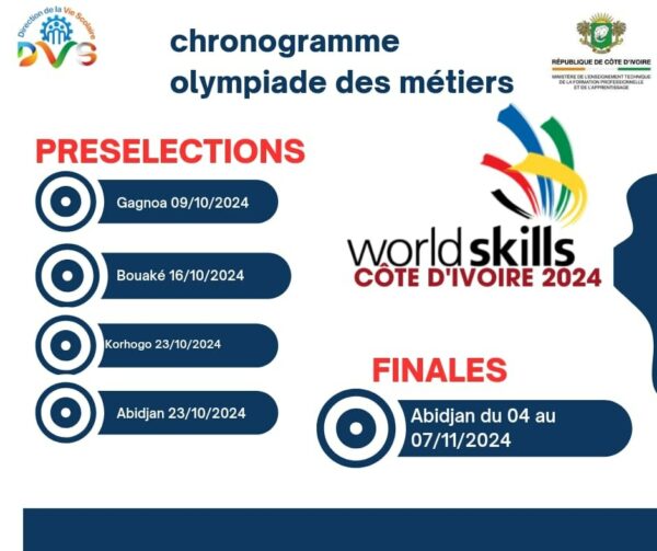 Paradmin14769 octobre 2024Olympiades des Métiers – WorldSkills Côte d’Ivoire 2024, la ville Gagnoa ouvre le bal des présélections demain : Voici les Métiers et les...