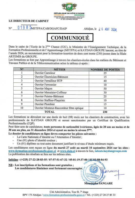 Paradmin147628 août 2024Abidjan, le 27 août 2024 – Dans le cadre de sa politique d’insertion professionnelle des jeunes diplômés des Lycées professionnels, le ministère de...