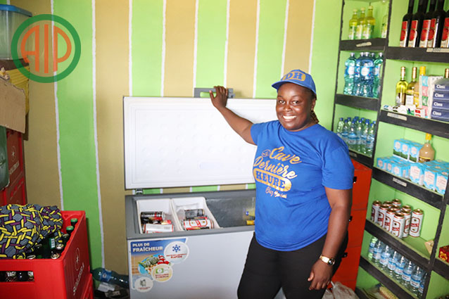 Mlle Ory Corinne n’avait pas de congélateur ni de réfrigérateur pour la conservation des boissons et des produits alimentaires au moment où elle postulait pour le projet. Elle a sollicité un prêt de 500 000 FCFA, mais après l’examen du comité de gestion du projet, elle a bénéficié d’un financement de 700 000 FCFA qui lui ont permis d’acheter un congélateur, des compléments de meubles, d’accroître l’achat des produits alimentaires et des boissons. Seule au démarrage de son activité, elle a employé deux jeunes filles pour l’aider, après l’obtention du soutien financier.