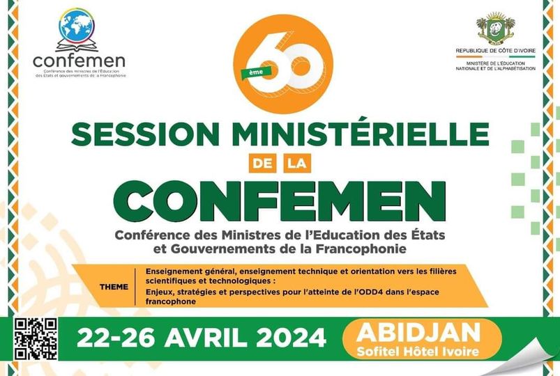 La Côte d’Ivoire accueille les Ministres de l’Éducation Nationale des 44 États et Gouvernements de la Francophonie (#CONFEMEN), dans le cadre de la 60è Ministérielle autour du thème :《Enseignement général, enseignement technique et orientation vers les filières scientifiques et technologiques. Enjeux, stratégies et perspectives pour l’atteinte de l’ODD4 dans l’espace francophone》.