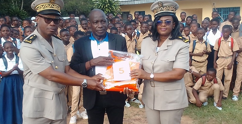 En souvenir de cette cérémonie, le directeur départemental de la Jeunesse, Brédou Kouakou, a remis un exemplaire du drapeau national au proviseur Doulaye Silué.