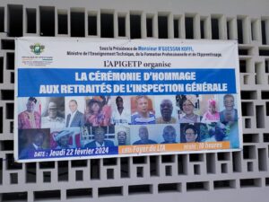 Le Directeur des Ressources Humaines du Ministère de l’Enseignement Technique, de la Formation Professionnelle et de l’Apprentissage, Hamidou COULIBALY, a présidé, ce Jeudi 22 février 2024 au Foyer du Lycée Technique de Cocody, au nom de Monsieur le Ministre N’Guessan KOFFI, la triple Cérémonie d’Hommage aux Retraités, de Célébration des Nouveaux IETP et de Réception des Animateurs Pédagogiques Régionaux (APR).