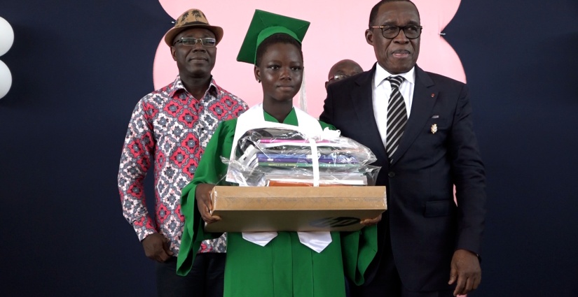 Mlle Basoussou Abran Yamé Marie-Grâce, élève de quatrième au collège Le Jourdain d’Aboisso, avec une moyenne de 19,36/20, a été classée première de tous. Elle a reçu le prix spécial Aka Aouélé, qui consiste en des ordinateurs, du matériel didactique, entre autres.