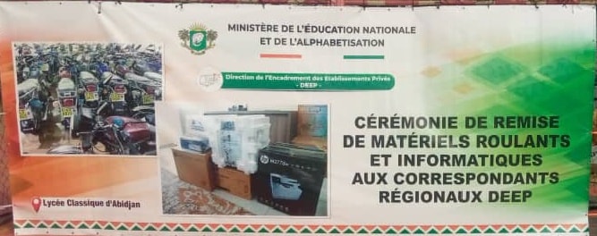 En effet, ce mardi 28 mai 2024, s’est tenue au Lycée Classique à Abidjan, la cérémonie de remise de matériels roulants et informatiques. Il était question de remettre des engins ( motos ), aux directeurs régionaux afin de faciliter les déplacements de leurs collaborateurs , pour une efficacité des tâches qui leur incombent .