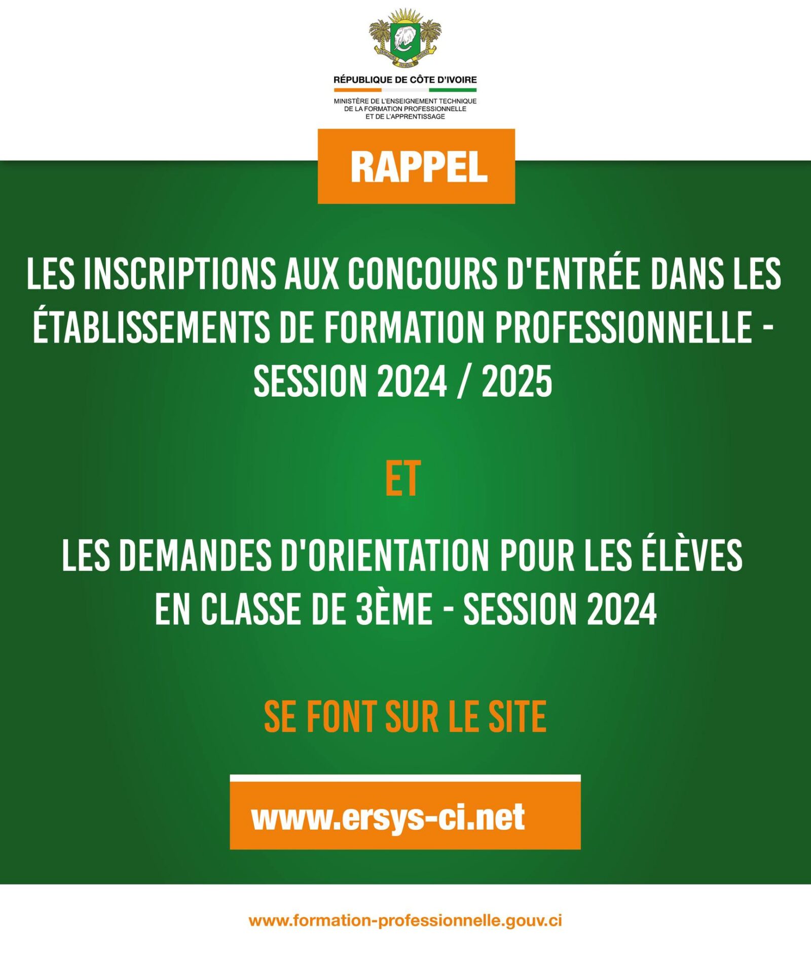 RAPPEL: Les inscriptions aux concours d’entrée dans les établissements de Formation Professionnelle – 2024 / 2025 se font sur le site www.ersys-ci.net
