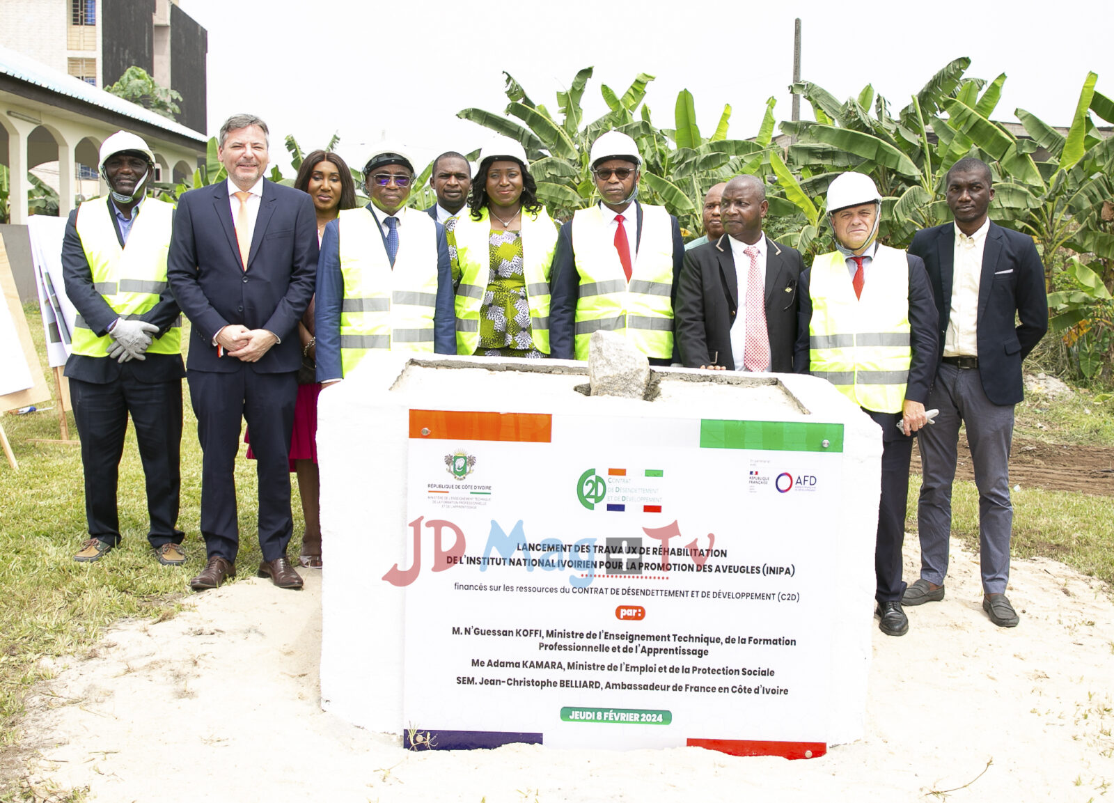 En présence de S.E.M. Jean Christophe BELLIARD, ambassadeur de France en Côte d’Ivoire, le ministre N’Guessan KOFFI et le ministre de l’Emploi et de la Protection Sociale, Me Adama KAMARA, ont organisé le jeudi 08 février 2024, la double cérémonie de remise d’équipement et de lancement des travaux de réhabilitation de l’Institut National Ivoirien de Promotion des Aveugles (INIPA) de Yopougon, au sein dudit institut.