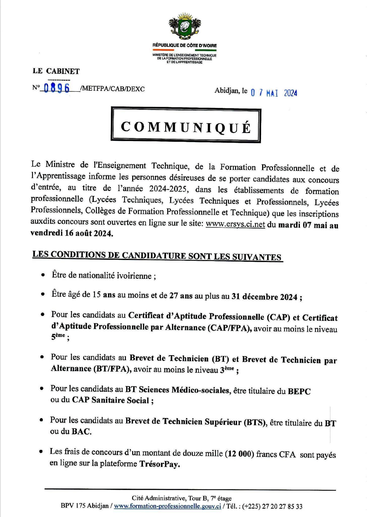Ministère de l’Enseignement Technique et de la Formation Professionnelle / Concours d’entrée dans les établissements de Formation Professionnelle – 2024 / 2025.