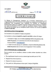Enseignement Technique / Examens de la session 2023 de certification des compétences pour l’obtention du certificat de qualification professionnelle (cqp) et du certificat d’aptitude professionnel (cap) par la validation des acquis de l’expérience (VAE)