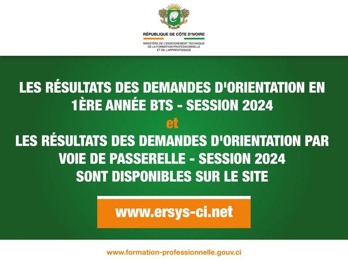 Les résultats des demandes d’orientation en 1ère année BTS – session 2024 et les résultats des demandes d’orientation par voie de passerelle – session 2024 sont disponibles sur le site www.ersys-ci.net.