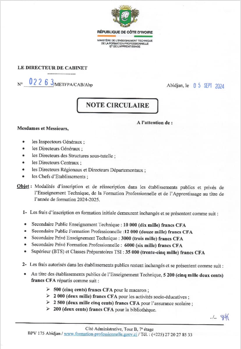 Enseignement Technique / Modalités d’inscription et de réinscription dans les établissements publics et privés de l’Enseignement Technique, de la Formation Professionnelle et de l’Apprentissage au titre de l’année de formation 2024-2025.