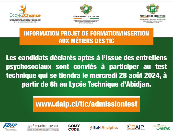 Projet de formation : Insertion aux métiers des TIC, les candidats déclarés aptes à l’issue des entretiens psychosociaux sont conviés à participer au test technique qui se tiendra le mercredi 28 août 2024, à partir de 8h au Lycée Technique d’Abidjan.