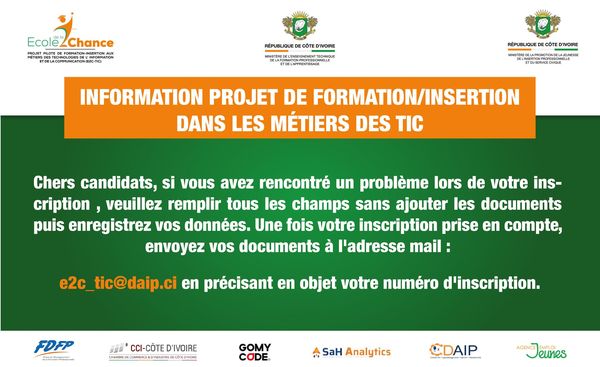 NB: Chers candidats, si vous avez rencontré un problème lors de votre inscription, veuillez remplir tous les champs sans ajouter les documents puis enregistrez vos données. Une fois votre inscription prise en compte, envoyez vos documents à l’adresse mail e2c_tic@daip.ci en précisant en objet votre numéro d’inscription.