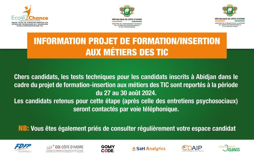 Enseignement Technique – Technologies / Information projet de formation insertion aux métiers des TIC, Les tests techniques pour les candidats inscrits à Abidjan dans le cadre du Projet de formation-insertion aux métiers des TIC sont reportés à la période du 27 au 30 Août 2024.