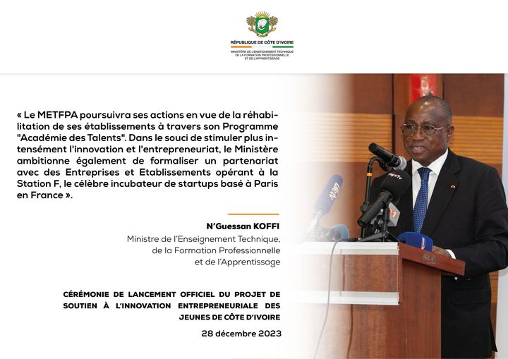 « Le METFPA poursuivra ses actions en vue de la réhabilitation de ses établissements à travers son Programme « Académie des Talents ». Dans le souci de stimuler plus intensément l’innovation et l’entrepreneuriat, le Ministère ambitionne également de formaliser un partenariat avec des Entreprises et Etablissements opérant à la Station F, le célèbre incubateur de startups basé à Paris en France. (…) ».