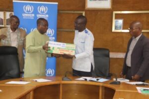 Dr Issa OUÉDRAOGO, Secrétaire général, représentant le Ministre de la santé et de l’hygiène publique, a réceptionné des mains du Représentant du Haut-Commissariat des Nations unies pour les réfugiés au Burkina Faso, Maurice AZONNANKPO, un important lot de produits médicaux et une ambulance flambante neuve.