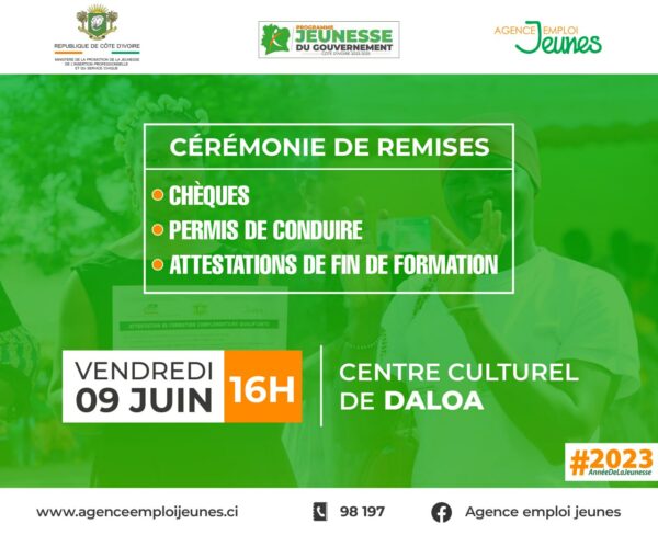 Paradmin147619 juin 2023Ce vendredi 9 juin 2023, le centre culturel de Daloa accueillera une cรฉrรฉmonie de remises de chรจques, de permis de conduire et d’attestations...