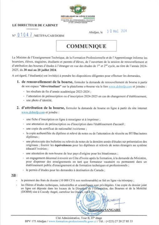 Paradmin147610 août 2023L’Ambassade de la République Arabe d’Égypte en Côte d’Ivoire, informe que le Gouvernement Égyptien octroie des bourses d’études dans différentes universités égyptiennes pour...