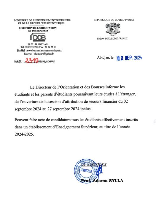 Enseignement Supérieur / Bourses hors Côte d’Ivoire. Source : enseignement.superieur.ci Nombre de vues / Téléchargement : 363