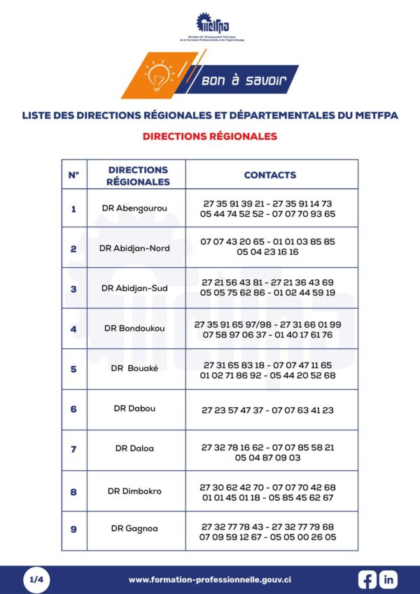 LISTE DES DIRECTIONS REGIONALES ET DEPARTEMENTALES Source : METFPA Nombre de vues / Téléchargement : 413